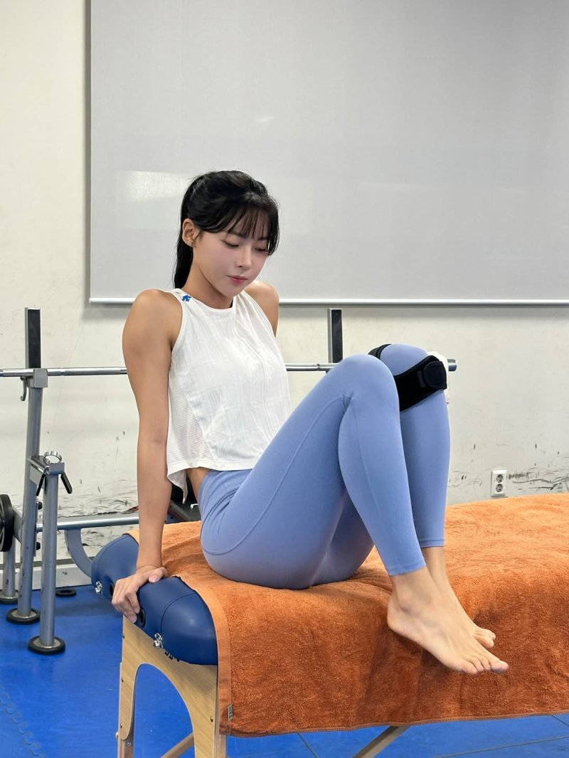 공개된 사진 속 김민지는 밑단이 짧아 허리 라인이 드러나는 흰색 민소매 티에 연한 보랏빛 톤의 레깅스를 입고 실내 체육관에서 운동하고 있다.