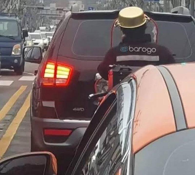 18일(현지시간) 온라인 커뮤니티 보배드림에는 헬멧이 아닌 주방용 양은냄비를 머리에 뒤집어쓴 채 도로를 주행하는 배달기사의 모습이 담긴 사진이 올라왔다.