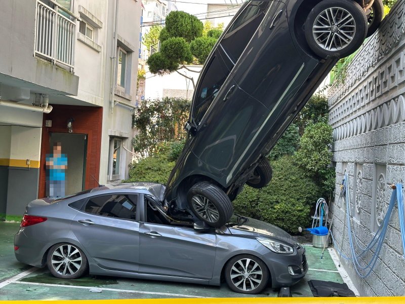 게시물에 따르면 집 앞 주차장에 위쪽 공터에 주차 중이던 차량이 안전 펜스를 뚫고 떨어지는 사고가 발생했다. 이에 따라 주차장에 잘 주차해 놓은 A씨 어머니의 차가 완전히 박살이 났다.