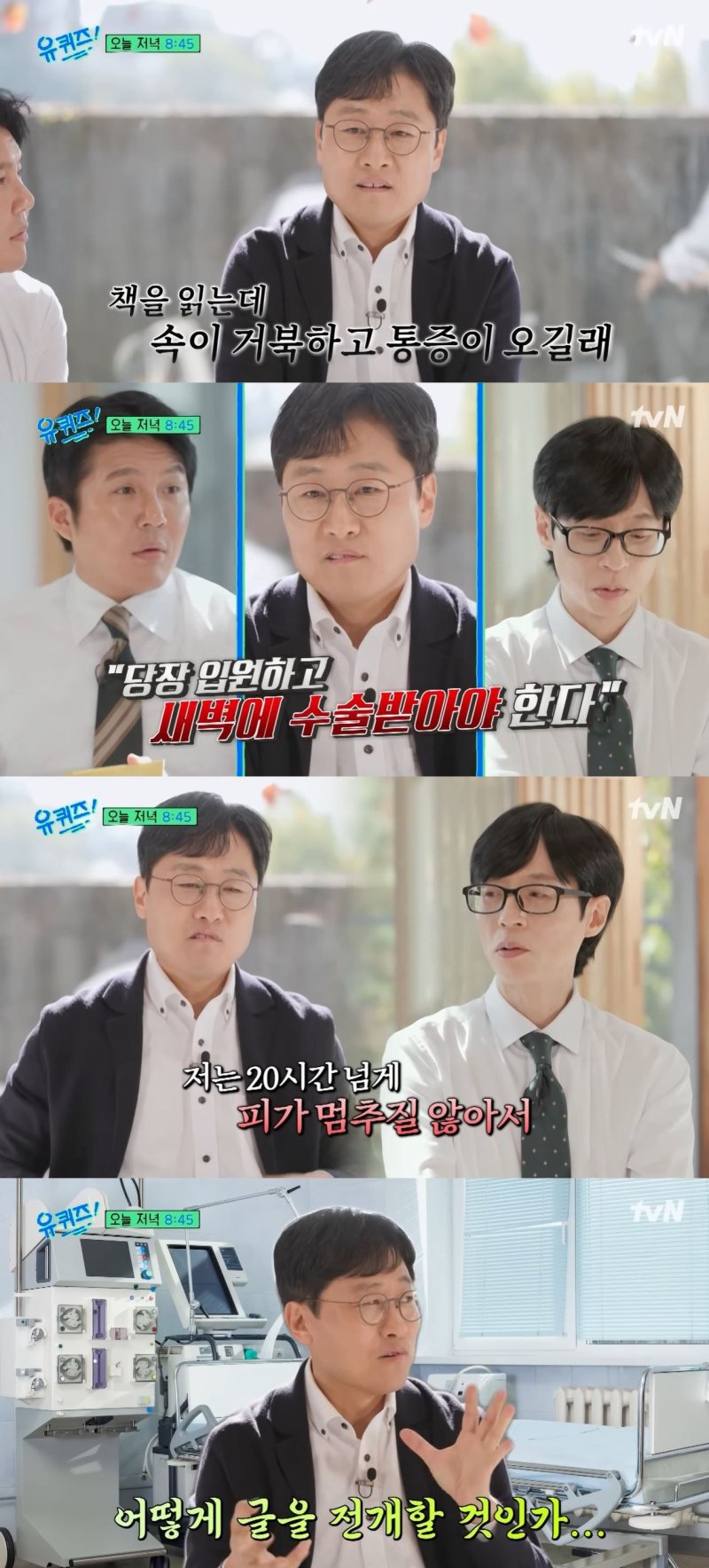그는 "의사가 피도 뽑고 검사를 하더니 당장 입원하고 새벽에 수술 받아야 한다고 하더라"라고 한다.
