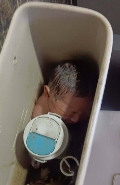 아기는 아무것도 입지 않은 채 반쯤 찬 물탱크 안에 갇혀 있었고, 아기의 피부는 물에 젖어 창백한 상태였다.