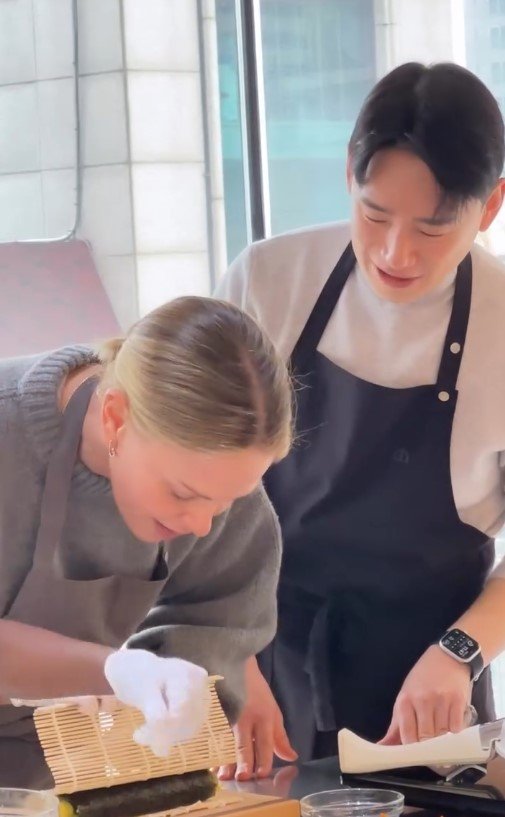 공개된 사진 속 테론은 앞치마를 두른 채 김밥을 정성스럽게 말고 있다. 최 셰프는 옆에서 미소를 지으며 조심스럽게 과정을 돕고 있다.