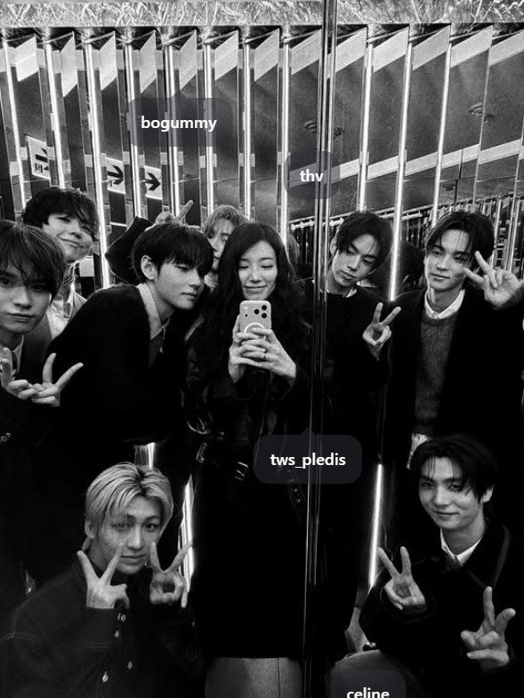 사진 속에는 이들이 한데 모여 포즈를 취한 모습이다. 박보검과 뷔, 수지, 투어스라는 역대급 조합과 선남선녀 비주얼이 눈을 뗄 수 없게 만든다.