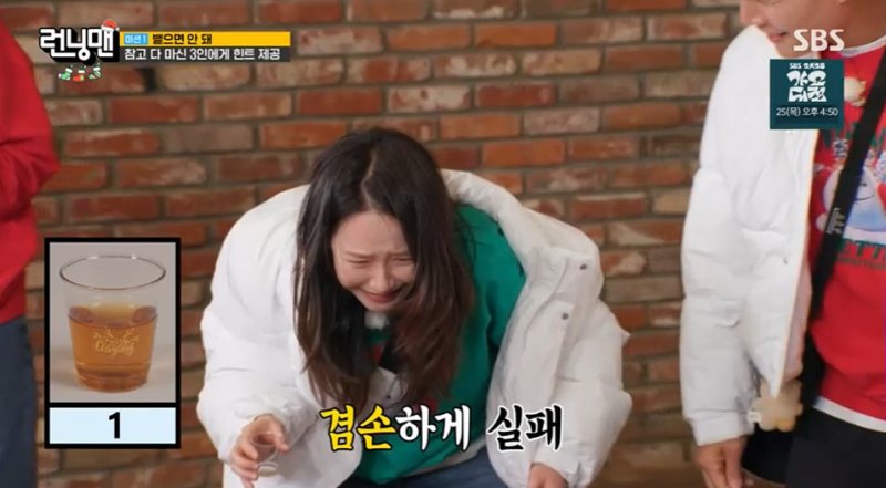 이후 멤버들은 선물 힌트를 얻기 위해 첫 번째 게임 '뱉으면 안 돼'에 나섰다. 강한 음료를 참고 마신 상위 3인에게 힌트가 주어지는 게임으로, 지예은과 송지효는 각각 소금 탄 음료와 까나리액젓에 탈락했다. 지석진은 식초를 버텼지만, 고삼차에서 결국 실패했다.
