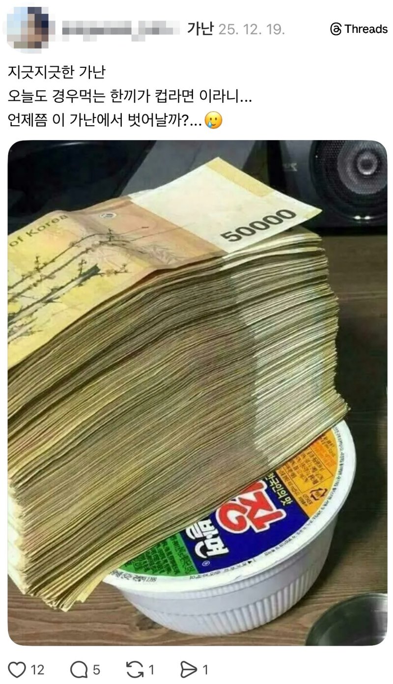 글쓴이 A씨는 "지긋지긋한 가난, 오늘도 겨우 먹는 한 끼가 컵라면이라니, 언제쯤 이 가난에서 벗어날까?"라며 컵라면 위에 오만원권 현금 다발을 쌓아 올린 사진을 게시했다.