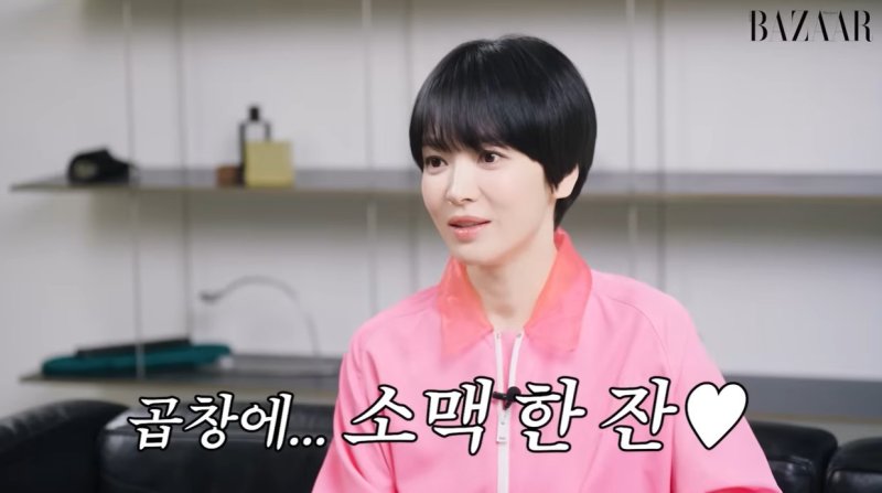 송혜교는 26일 유튜브 채널 '바자 코리아'에 공개된 인터뷰 영상에서 "힘든 촬영 끝나고는 스태프들이랑 같이 곱창 먹으러 간다. 곱창에 소맥 한 잔 먹는다"고 말했다.