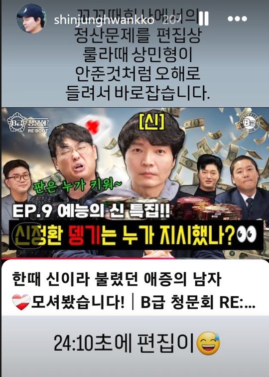 신정환은 이후 이상민 게시물에 "B급청문 24:10에 꼬꼬때 회사의 정산을 얘기한 건데 편집이 되어 마치 상민 형이 그런 것처럼 들리네요. 팬분들 미안합니다. 형 쏘리~빠른 수정 조치 해달라 했습니다"라고 댓글을 달았다.