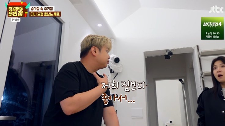 거실과 주방이 공개됐다. 윤남노 셰프가 "우리 집보다 좋다. 싱크대, 인덕션, 선반에 냉장고까지 다 있네"라고 신기해했다. 또 조명을 켠 뒤에는 "이거 세트장 조명인 줄 알았는데, 진짜네"라며 연신 감탄해 웃음을 더했다.