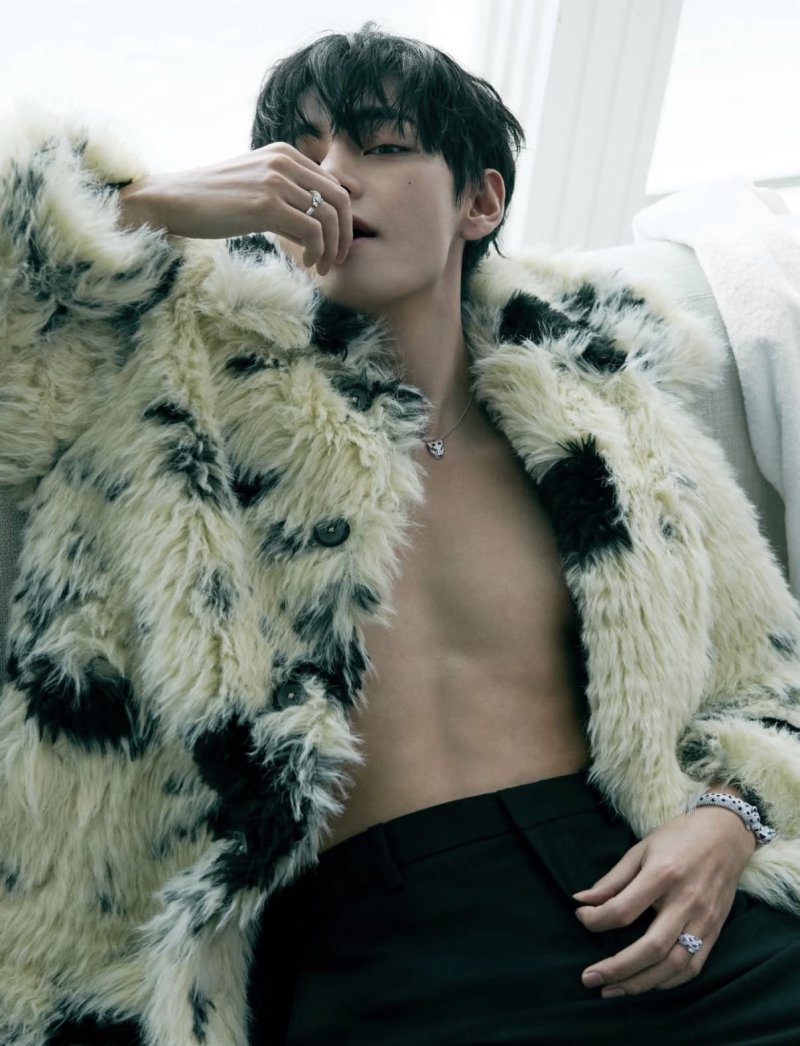 사진 속 퍼 소재의 겉옷을 걸친 채 탄탄한 복근을 드러내며 카리스마를 뽐냈다. 또한 뷔 특유의 몽환적인 표정과 비주얼로 이목을 집중시켰다.