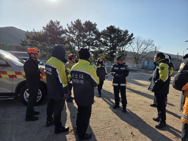 [보령=뉴시스] 지난 28일 충남 보령 대창초등학교에서 경찰과 소방대원들이 실종자 수색에 나서기 전 한데 모여 회의를 하고 있다. (사진=보령소방서 제공) 2026.01.31. photo@newsis.com *재판매 및 DB 금지
