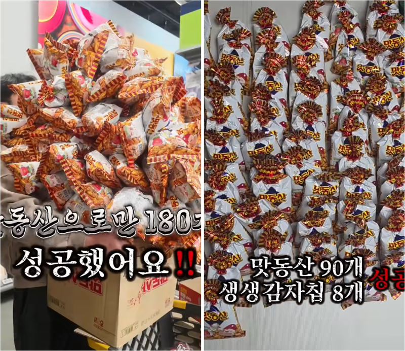 온라인 등에 올라온 걸 보면 1인당 구매하는 과자는 평균 50~60봉 정도다. 100봉 이상 구매했다는 인증글도 어렵지 않게 찾아볼 수 있다. 인기 품목은 맛동산이다. 맛동산만 180봉을 구매했다는 숏폼도 올라왔다. 1봉당 138.8원이다.