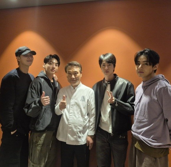 사진 속 후덕죽과 함께 한 이들은 방탄소년단 RM, 정국, 진, 뷔다. 이들은 '엄지 척' 포즈를 하고 화기애애한 분위기 속 사진을 찍었다.