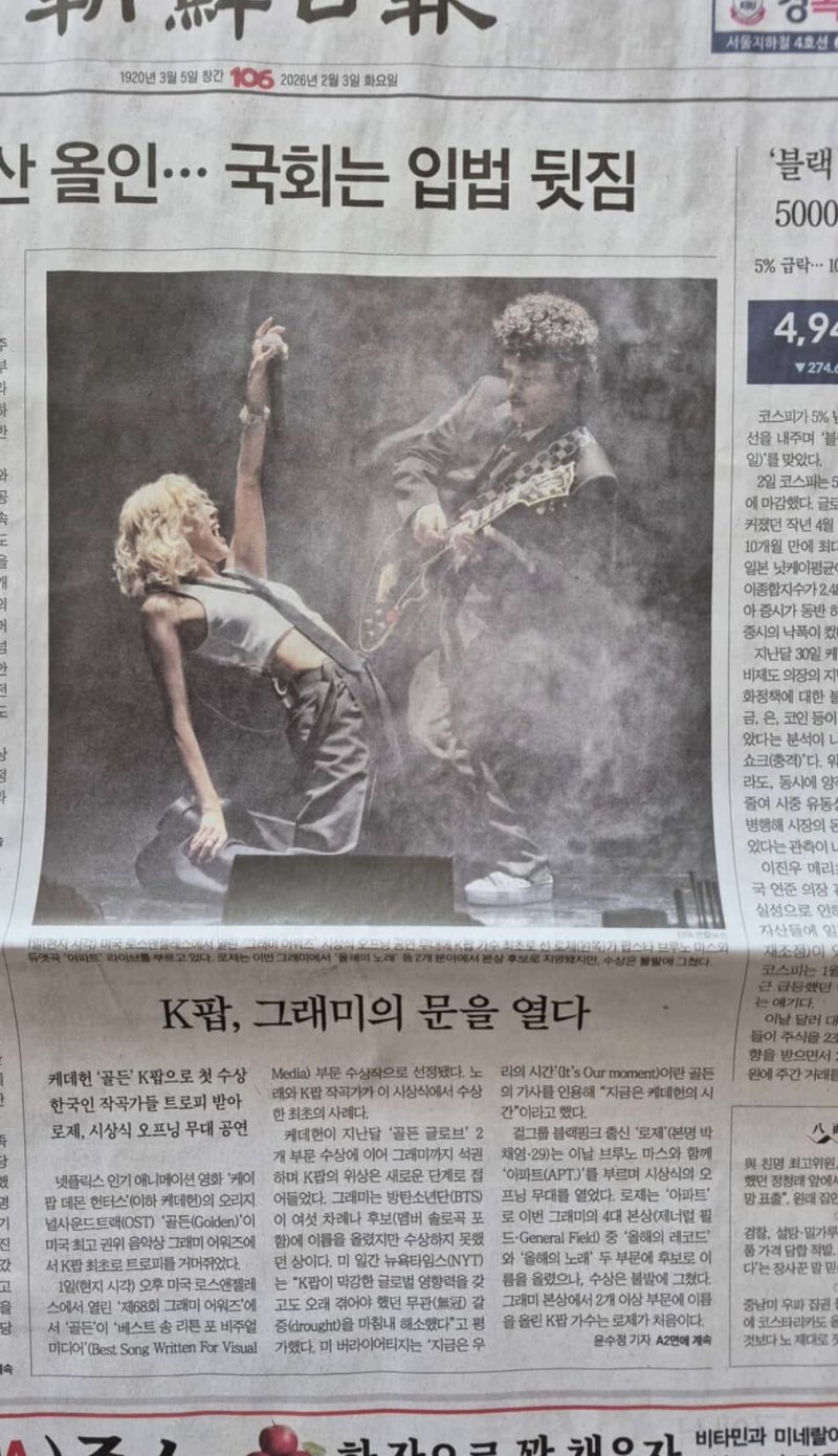 그는 5일 소셜미디어에 'K팝, 그래미의 문을 열다'라는 제목의 조선일보 기사 사진을 공유했다.