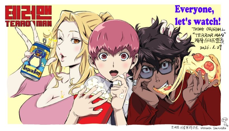 '테러맨'의 작화를 총괄한 우메하라 타카히로 감독이 애니메이션 공개를 기념하며 전한 스페셜 축전 이미지가 공개돼 이목이 쏠린다. 소소하지만 행복으로 가득 찬 일상을 만끽하는 정우, 릴리아, 봉춘의 모습이 반가움을 자아낸다.