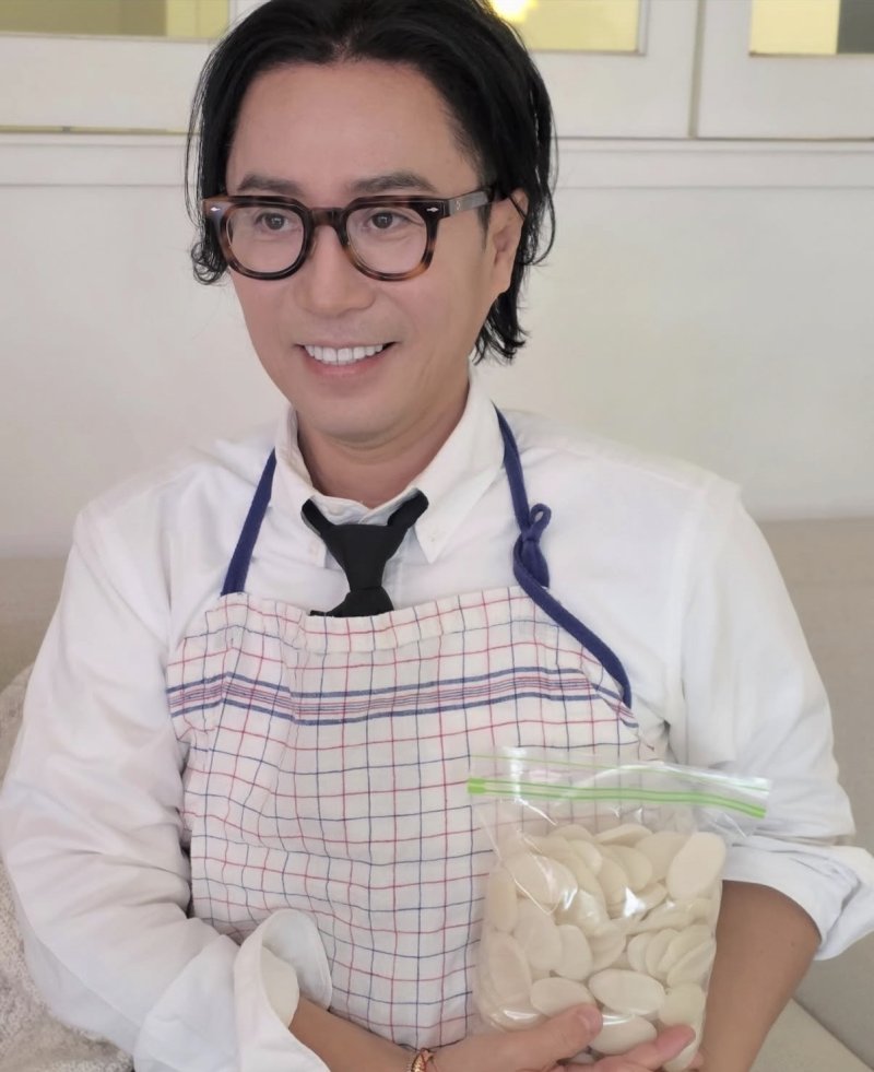 사진 속에서 정재형은 앞치마를 두른 채 떡국떡 봉지를 소중하게 품에 안고 미소를 짓고 있다.
