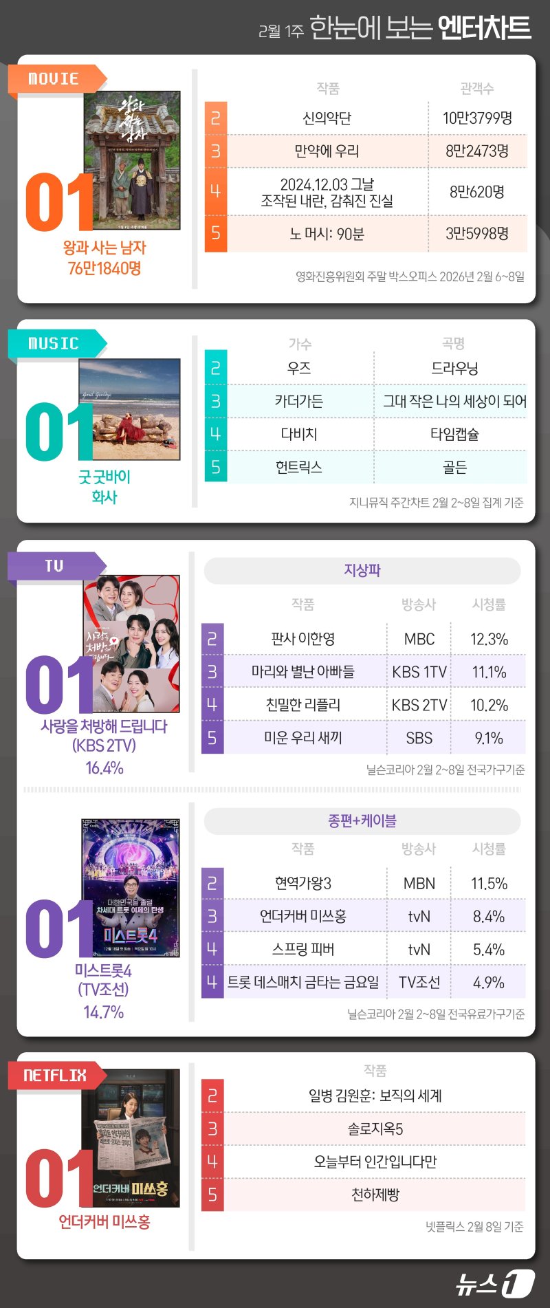 지상파=KBS 2TV '사랑을 처방해 드립니다' 1위(닐슨코리아 2026년 2월 2~8일 전국 가구 기준)