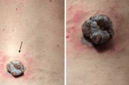 흑색종은 피부 내 색소를 생성하는 멜라닌 세포에서 기인하는 악성 종양이다. 특히 결절성 흑색종의 경우, 대개 급속도로 성장하며 피부 외부로 돌출된 결절 형태로 발현된다. 궤양 및 출혈 동반 역시 흔히 관찰되는 증상이다.