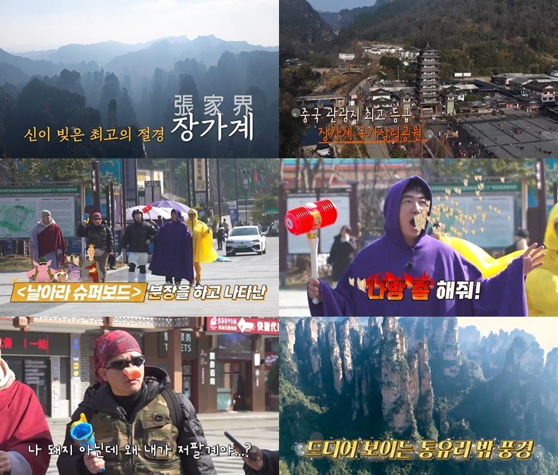 영화 '서유기' 촬영지로도 유명한 곳에서 멤버들은 '날아라 슈퍼보드' 캐릭터로 분장한다.