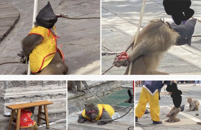 또 다른 사진에는 원숭이 입에 금속 재질의 입마개가 채워져 있고 목에는 긴 밧줄이 묶여 있는 모습이 담겼다. 일부 확대 사진에서는 얼굴 부위에 상처를 입어 피가 흐르는 장면도 포착됐다.