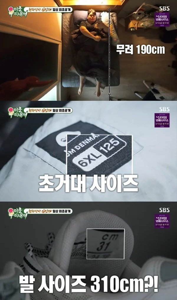 김민재는 6XL 사이즈의 옷을 입었고, 신발 사이즈는 310㎜로 신발장이 제대로 닫히지 않았다.