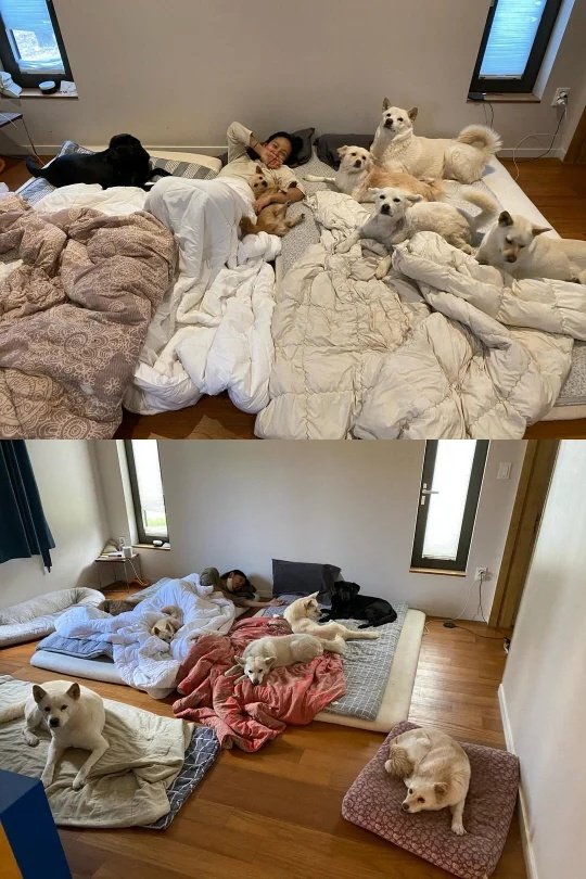 공개된 사진 속 방바닥에는 이불과 매트가 펼쳐져 있고, 반려견들은 제각각 자리를 잡은 채 낮잠을 즐기고 있다.