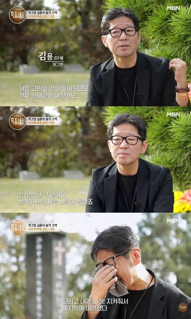 김용은 특히 고 최진영의 묘소를 찾아 "형 왔다. 미안하다 13년 만에 왔다. 고맙고 미안했어"라며 오열했다. 그는 "내가 너 못 지켜줘서 마지막에 미안했다"라고도 말했다.