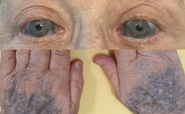 의료진이 검사한 결과 실제 여성의 다리와 손, 얼굴, 눈, 손톱, 치아, 잇몸 등에서 푸르스름한 회색 반점이 관찰됐다.