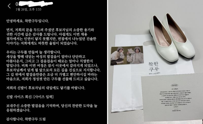 8일 여성화 브랜드 '착한구두'에 따르면 해당 업체는 최근 진행된 채용 면접 전형에서 탈락한 지원자들에게 신발 사이즈를 확인한 뒤 자사 구두를 선물했다.