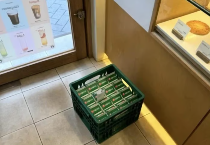 해당 사진에는 카페 매장 바닥에 배달원이 놓고 간 것으로 추정되는 우유 상자가 놓여있다.