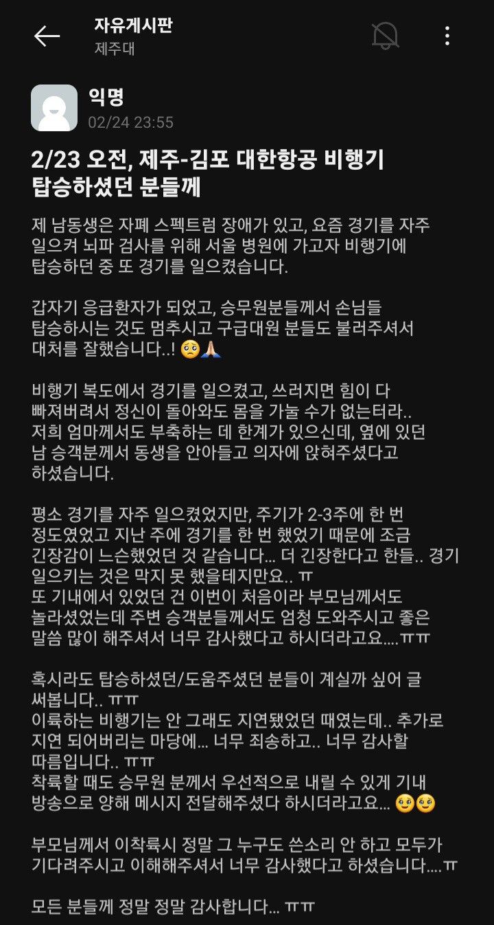 [파이낸셜뉴스] 자폐 스펙트럼 장애를 가진 남동생이 비행기 탑승 중 갑자기 발작을 일으킨 상황에서 승무원과 승객들의 도움으로 무사히 여정을 마쳤다는 사연이 온라인에서 화제다. 최근 대학생 커뮤니티 에브리타임에는 '2월 23일 오전 제주-김포 대한항공 비행기 탑승하셨던 분들께'라는 제목의 글이 게재됐다. 작성자 A씨에 따르면, 자폐 스펙트럼 장애가 있는 남동생은 최근 발작이 잦아져 뇌파 검사를 받기 위해 부모님과 함께 서울행 비행기에 올랐다. 그런데 남동생은 기내 통로에서 갑자기 발작을 일으키며 쓰러졌다. 다행히 승무원과 구급대원의 신속한 대처로 남동생은 의식을 회복했다. 하지만 발작으로 인해 온몸의 힘이 빠진 남동생을 A씨의 어머니가 부축하는데 어려움이 있었다. 이때 옆에 있던 남자 승객이 나섰다. 그는 A씨의 어머니를 대신해 쓰러진 남동생을 안아 들어 좌석에 앉을 수 있게 도왔다. 남동생이 기내에서 발작을 일으킨 것은 처음이었던 터라 부모님도 적잖이 당황했었다. 하지만 주변 승객들의 도움과 따뜻한 말 한마디에 부모님은 큰 위안을 얻었다. 또한 A씨의 가족은 착륙 후에도 승무원의 배려로 먼저 내릴 수 있었다. A씨는 "부모님께서 이착륙시 그 누구도 쓴 소리 없이 기다려주시고 이해해주셔서 너무 감사했다고 하셨다"며 "(당시 비행기에 탑승하셨던) 모든 분들께 진심으로 감사드린다"고 전했다. 사연을 접한 누리꾼들은 "세상이 아직 살 만하다", "도와주신 분, 기다려주신분, 배려해주신 분 모두 복 받으시길" "아름다운 분들이다", "이게 진정한 대한민국이다", "우리나라 아직은 괜찮다"라는 반응을 보였다. [따뜻했슈] 보고싶지 않은 뉴스가 넘쳐나는 세상, 마음 따뜻한 사람들의 이야기를 전합니다. "토닥토닥, 그래도 살만해" 작은 희망을 만나보세요. sms@fnnews.com 성민서 기자