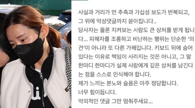 [파이낸셜뉴스] 전 펜싱 국가대표 남현희(44)씨가 전 연인 전청조(29)씨의 사기 방조 혐의 등에서 벗어난 가운데, "너무 힘들다. 악의적인 댓글을 멈춰달라"고 호소했다. 남씨는 지난 14일 자신의 SNS를 통해 "내가 느끼는 분노와 슬픔은 아주 정당하다"며 "사실과 거리가 먼 추측과 가십성 보도가 반복되고, 그 위에 악성댓글까지 쏟아진다. 당사자는 물론 지켜보는 사람도 큰 상처를 받게 된다"고 토로했다. 이어 "피해자를 조롱하고 비난하는 행위는 단순한 '의견'이 아니라 또 다른 '가해'"라며 "키보드 뒤에 숨어 있다는 이유로 책임이 사라지는 것은 아니고, 그 말 한 마디 한 마디가 사람에게 깊은 상처를 남긴다는 점을 스스로 인식해야 한다"고 덧붙였다. 이에 대해 남씨의 법률 대리를 맡은 법무법인 지혁의 손수호 변호사도 "심각한 모욕 댓글이 여전히 많이 달린다"며 "명백한 범죄고, 처벌 대상이다. 자제 부탁한다"고 말했다. 남씨는 전날 자신의 SNS에 서울동부지검의 불기소 결정문을 공개하며 관련 혐의에 대해 혐의 없음 처분을 받았다고 밝혔다. 결정문에서 검찰은 남현희에 대해 '증거 불충분'으로 혐의가 없다고 판단했으며, 전청조의 사기 범행이나 다른 범죄 행위를 인식했다고 보기보다는, 전청조에게 이용당한 것으로 판단했다는 내용도 담겼다. 한편, 남현희는 재벌3세 혼외자 행세를 한 전청조가 투자금 등을 모집하는 과정에서 도움을 줬다는 의혹을 비롯해 범죄수익 중 일부가 남현희 측 계좌로 넘어가거나 남현희 명의의 고급 주택·차량 임차에 사용됐다는 의혹을 받았다. 전청조는 30억원대 사기 혐의와 남현희의 조카를 폭행한 혐의 등으로 지난해 11월 대법원에서 징역 13년형을 확정받고 수감 중이다. moon@fnnews.com 문영진 기자