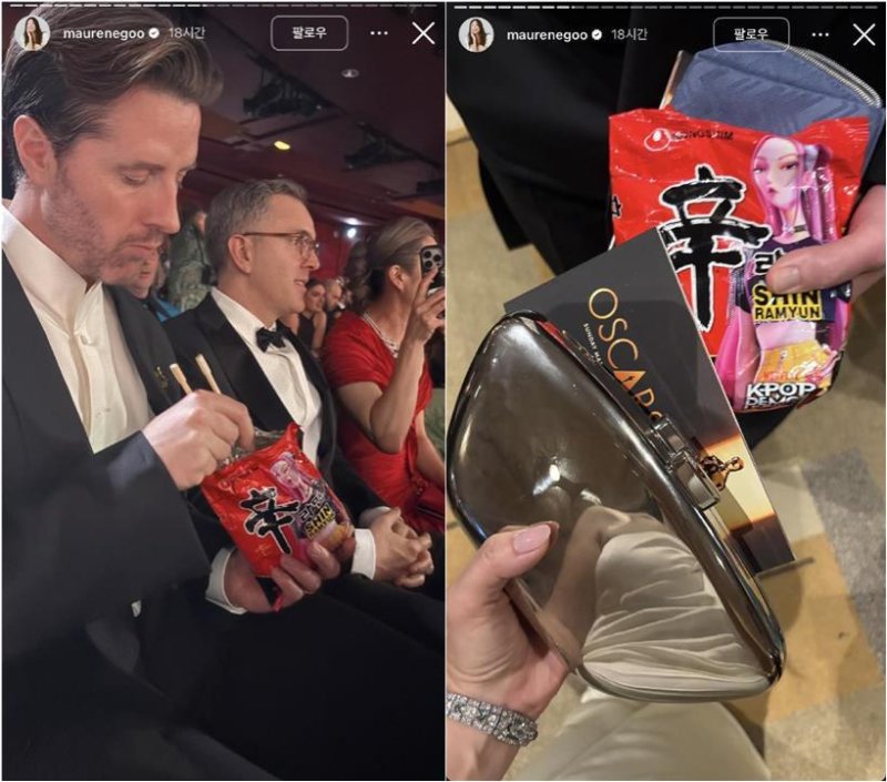 [파이낸셜뉴스] 제98회 미국 아카데미(오스카) 시상식에 농심 신라면이 등장해 눈길을 끌고 있다. 16일(현지시간) 넷플릭스 애니메이션 '케이팝 데몬 헌터스'(이하 케데헌)를 공동 연출한 크리스 아펠한스 감독의 배우자 마렌 구 작가는 자신의 인스타그램에 아펠한스 감독이 신라면을 먹고 있는 사진을 올렸다. 사진 속 턱시도를 입은 아펠한스 감독은 아카데미 시상식 객석에서 케데헌이 그려진 신라면 봉지라면을 뜯어 능숙하게 나무젓가락을 하는 모습이 담겼다. 구 작가는 시상식 입장권과 신라면 봉지를 들고 있는 사진도 함께 게시했다. 해당 사진이 공개되자 누리꾼들은 "합성이 아니라 진짜냐", "생라면 뿌셔먹으면 맛있지" 등의 반응을 보였다. 마렌 구 작가는 한국인 화가이자 유명 작가이며, 아펠한스 감독 역시 한국 문화에 깊은 애정을 가진 것으로 알려져 있다. 신라면 제조사인 농심은 케데헌과 협업해 대규모 마케팅을 펼치며 북미 시장 공략에 나섰다. 작품 속 캐릭터들이 컵라면을 먹는 장면이 등장하며 관심을 끌자 농심은 작품 속 그룹 '헌트릭스'의 루미, 미라, 조이가 패키지에 삽입된 신라면을 출시하기도 했다. 한편 케데헌은 골든글로브와 그래미에서 수상한 데 이어 아카데미 시상식에서 장편 애니메이션상과 주제가상을 받았다. 아펠한스 감독은 메기 강과 함께 '케이팝 데몬 헌터스' 시즌2 제작도 앞두고 있다. 에펠한스 감독은 MBC에브리원 '어서와 한국은 처음이지?'를 통해 아내인 마렌 구 작가와 '케이팝 데몬 헌터스'를 본 뒤 한글을 배우고 싶어 하는 5세 아들과 함께 한국 여행을 즐기는 모습을 공개할 예정이다. newssu@fnnews.com 김수연 기자